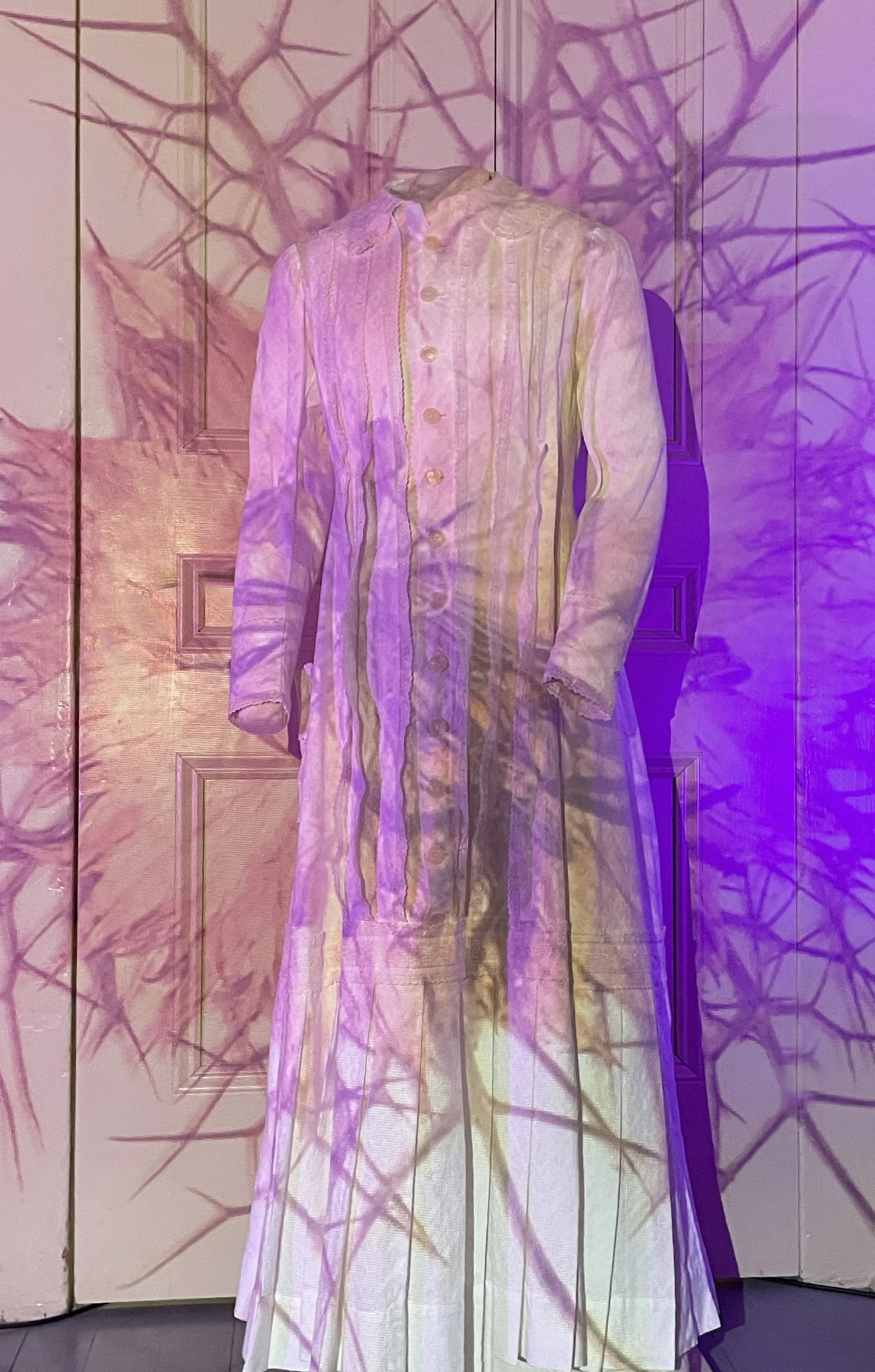 And so I pieced it, with a flower, now, features Emily Dickinson’s iconic white dress as a projection screen for images of her herbarium. I’ve animated and superimposed over 400 images of individual flowers collected by Dickinson as part of my video projection. The projection is paired with a haunting soundscape of hymns, drones, and birdsong by my collaborator, the composer D. Edward Davis. We installed the work in the Dickinson Homestead as a part of the Museum’s 139th Poetry Walk in 2025.