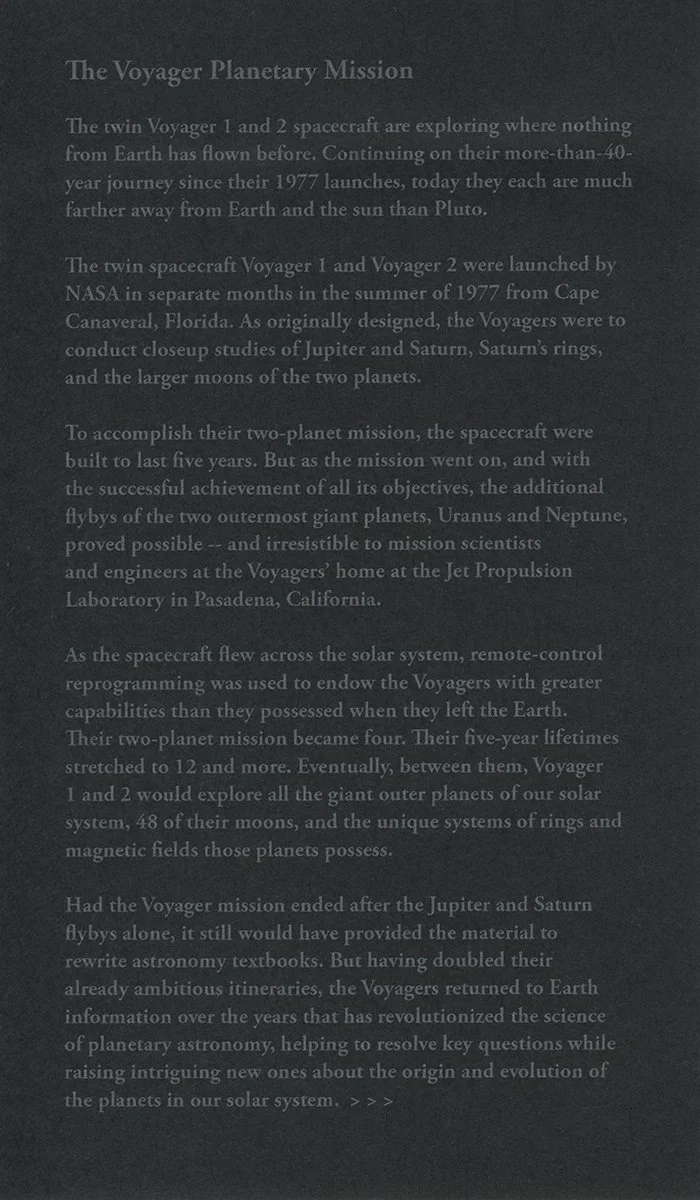 My selection of fourteen images in this first set shows the wide range of photographic information Voyager was able to capture in extraordinary conditions. Millions of miles away, under intense radiation, in extremely low light conditions, and using 20th century imaging technology, Voyagers’ visions are precarious and revelatory. For me, the images provide a glimpse into our cosmic neighborhood and a pathway to wonder about the community we are a part of beyond Earth. They demonstrate the limits and possibilities of what we can see and know. They express our collective desire to keep looking, to keep searching, and to keep learning about our place in the universe.
